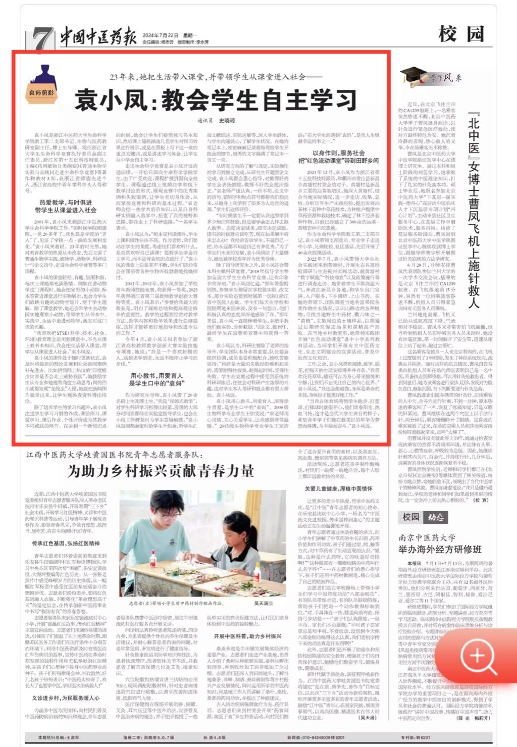 2022年7月,袁小凤带领大学生社会实践团来到黄塘村,开展生态共富经验调研与生态振兴实践活动,就黄塘村“数字赋能”“科技助农”以及政策施行等进行调查走访。她带着学生不惧高温天气,奔波在新昌乡各地,和学生出门宣讲、入户服务,下乡调研、上山寻药。在她的带领下,团队调查当地共富果园各类作物生长情况,认识山路边的各种植物,寻找当地野生中药材、衢六味之一“黄精”,采集周边的土壤样品,以期通过后期研究促进油茶和黄精高产高收。在当地乡村教室里,她带领实践团开展“红色流动课堂”进中小学系列教育活动,为同学们开展有关中医药文化、生态文明建设的宣讲活动,普及中医药文化知识。