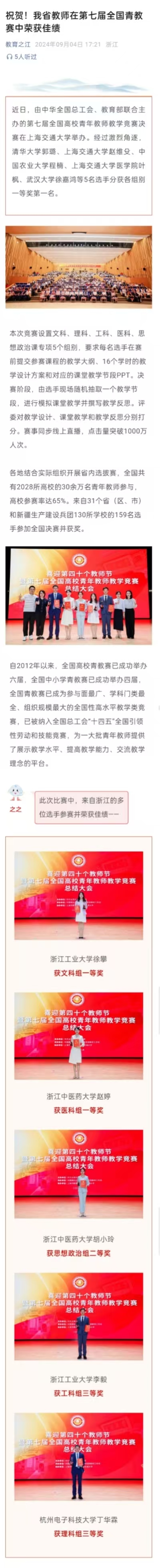 近日,由中华全国总工会、教育部联合主办的第七届全国高校青年教师教学竞赛决赛在上海交通大学举办。经过激烈角逐,清华大学郭璐、上海交通大学赵维殳、中国农业大学程楠、上海交通大学医学院叶枫、武汉大学徐嘉鸿等5名选手分获各组别一等奖第一名。