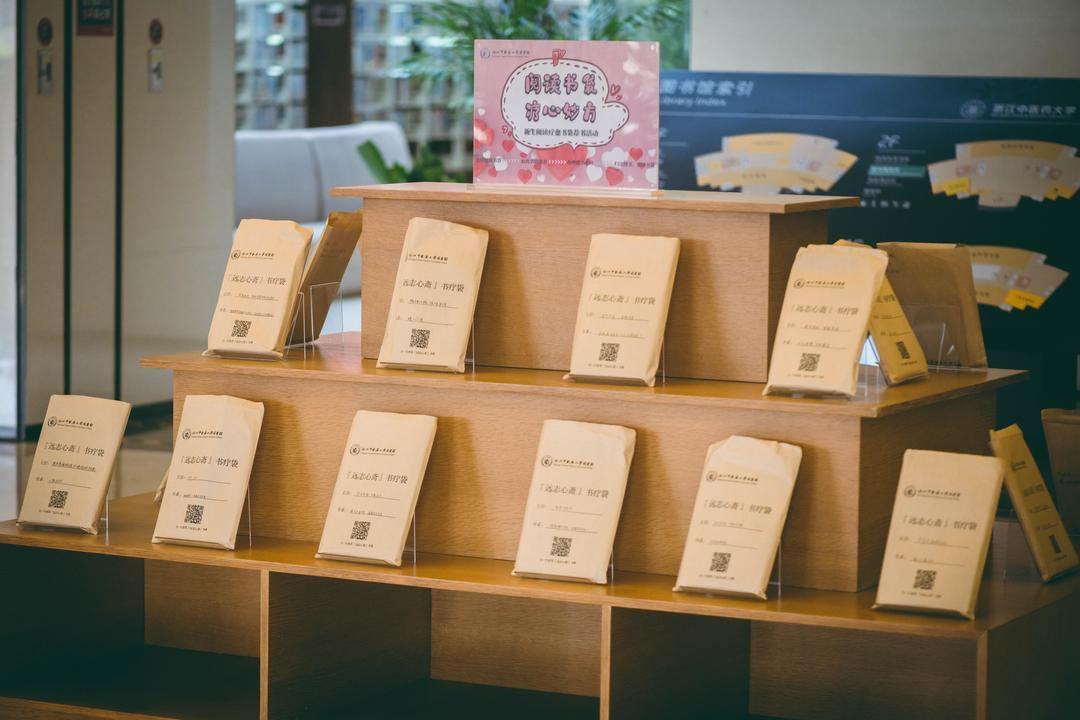 走进富春校区图书馆大厅,一个个为大学新生准备的健心书袋整齐地摆放在两个阶梯型书展架上。这些健心书袋为大一新生量身打造,针对可能出现的人际交往受挫、理想与现实的落差、新环境适应困难等情况,图书馆推荐了具有“拯救‘玻璃心’”“克服社恐”“走出情绪旋涡”等主治功效的50个书袋。