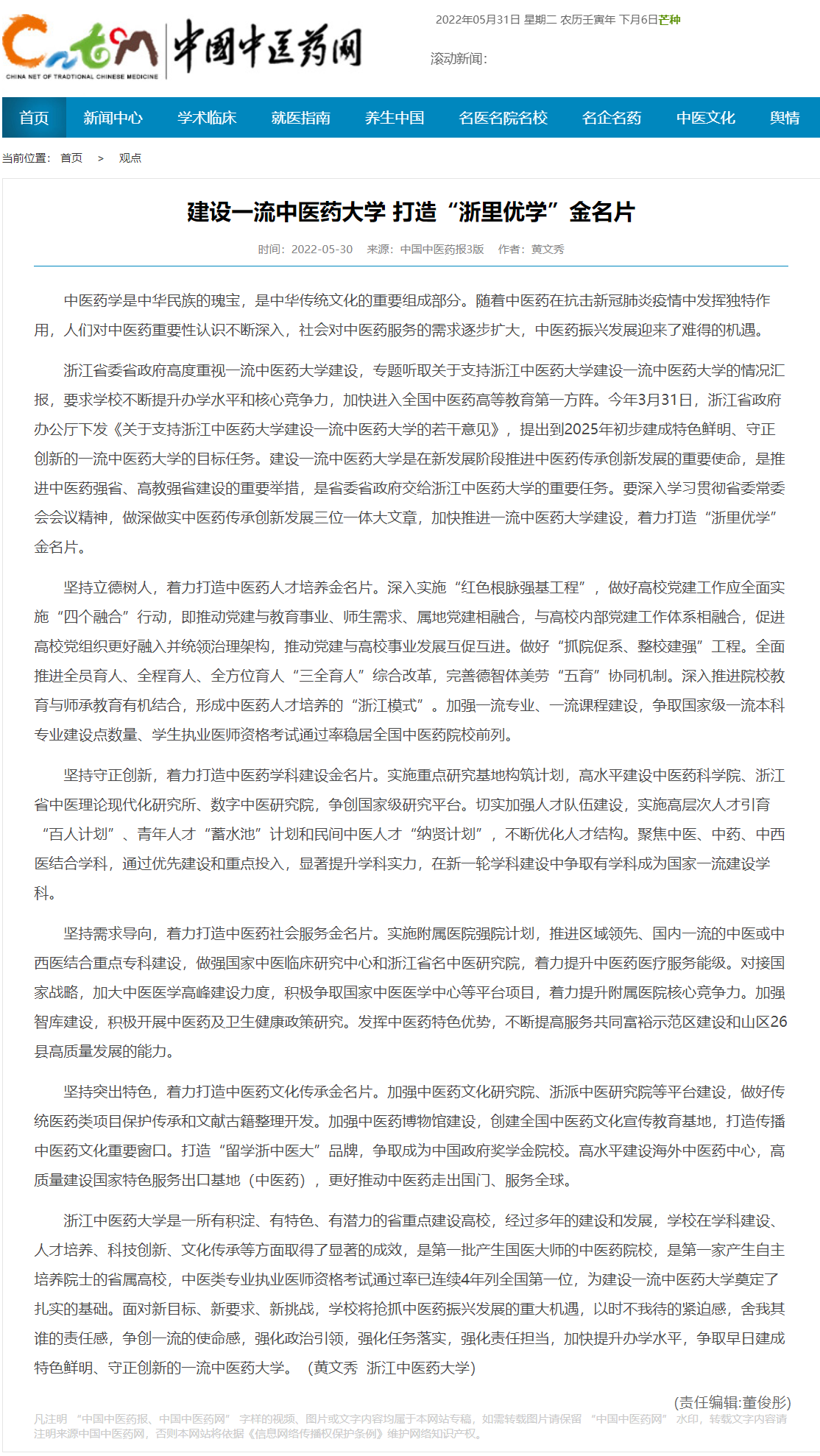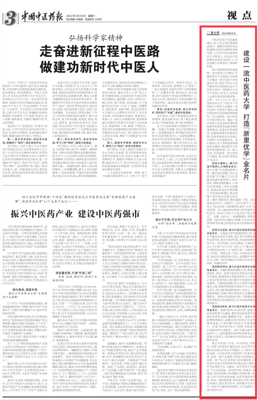 中国中医药报:建设一流中医药大学 打造“浙里优学”金名片