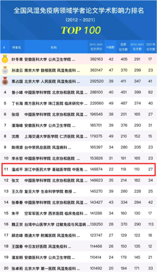 全国中医药院校第一!浙中医大温成平教授入选全国风湿免疫病领域论文学术影响力百强