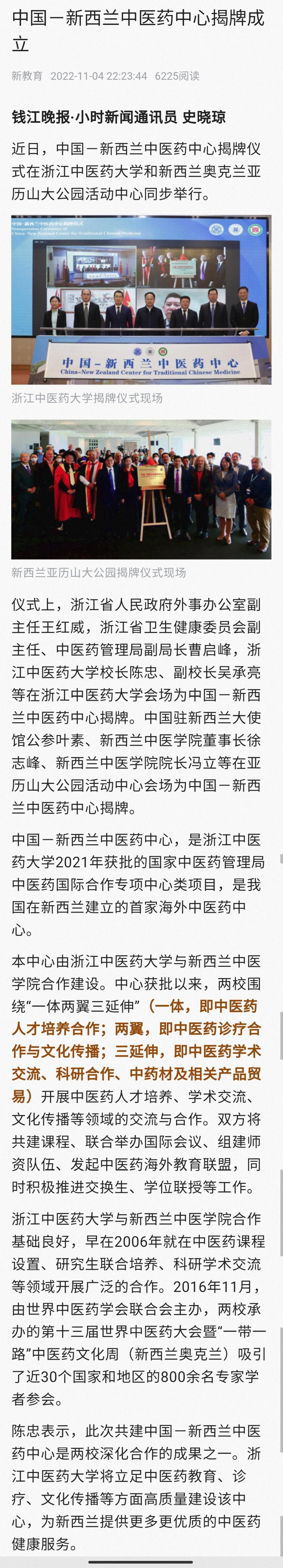 仪式上,浙江省人民政府外事办公室副主任王红威,浙江省卫生健康委员会副主任、中医药管理局副局长曹启峰,久久精品一区二区三区四区校长陈忠、副校长吴承亮等在久久精品一区二区三区四区会场为中国-新西兰中医药中心揭牌。中国驻新西兰大使馆公参叶素、新西兰中医学院董事长徐志峰、新西兰中医学院院长冯立等在亚历山大公园活动中心会场为中国-新西兰中医药中心揭牌。
