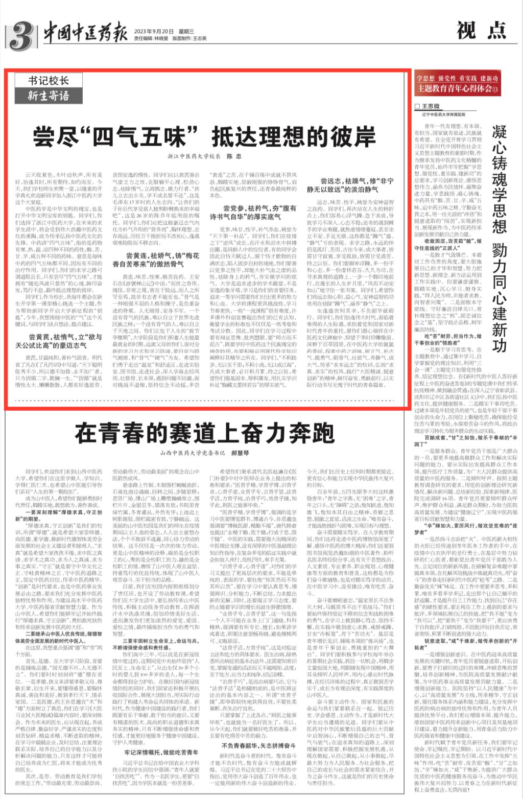 生逢盛世何其幸,不负韶华砥砺行。同学们,你们恰逢伟大时代,面临着难得的人生际遇,承担着党和国家对新时代青年的重托,愿你们潜心徜徉在中医药文化碑廊中、仰望于李时珍雕像前、深耕于百草园里,在中医药大学的氤氲药香间,探索中药之滋味,树正气、补志气、提勇气、砺骨气、壮底气、养静气、成大气,传承“求本远志”的校训,弘扬“求真、求实”的校风,践行“大医精诚、锐意创新”的精神,踔厉奋发、勇毅前行,以实际行动书写无愧于时代的青春篇章。