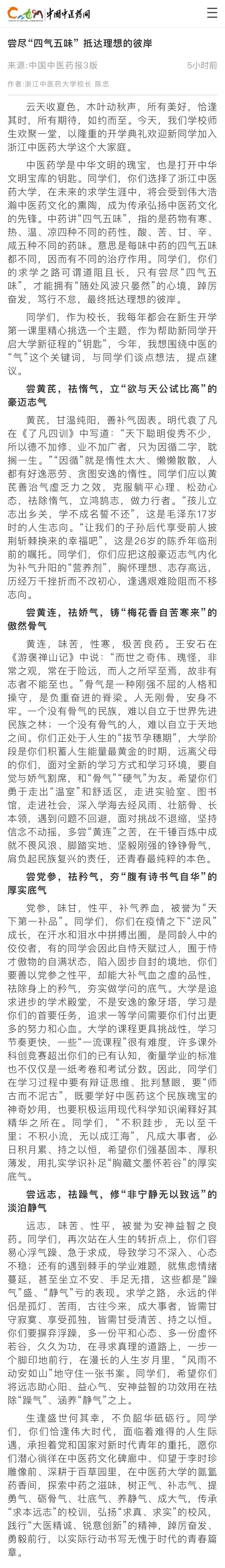中医药学是中华文明的瑰宝,也是打开中华文明宝库的钥匙。同学们,你们选择了久久精品一区二区三区四区,在未来的求学生涯中,将会受到伟大浩瀚中医药文化的熏陶,成为传承弘扬中医药文化的先锋。中药讲“四气五味”,指的是药物有寒、热、温、凉四种不同的药性,酸、苦、甘、辛、咸五种不同的药味。意思是每味中药的四气五味都不同,因而有不同的治疗作用。同学们,你们的求学之路可谓道阻且长,只有尝尽“四气五味”,才能拥有“随处风波只晏然”的心境,踔厉奋发,笃行不怠,最终抵达理想的彼岸。