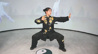 在中医药文化体验馆中心区设有一处环幕投影区,大屏幕上播放着八段锦的教学视频。来访者可以跟随屏幕学习每个动作,结束后系统会根据动作的完成程度给出模拟评分,分数高的人还有机会获赠一份中医药特色的小礼品或一枚徽章作为纪念。