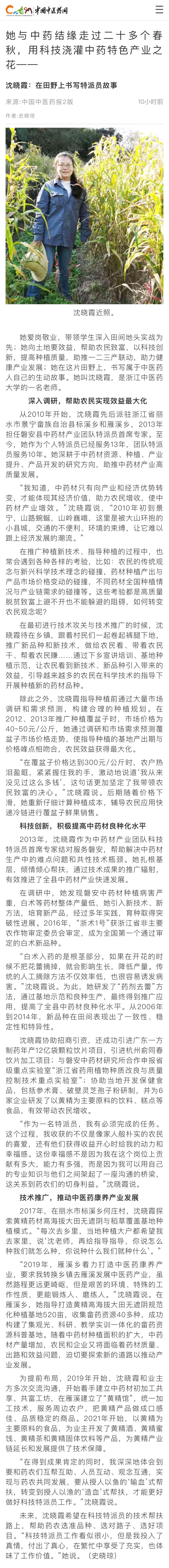 中国中医药报、中国中医药网:她与中药结缘走过二十多个春秋,用科技浇灌中药特色产业之花—— 沈晓霞:在田野上书写特派员故事
