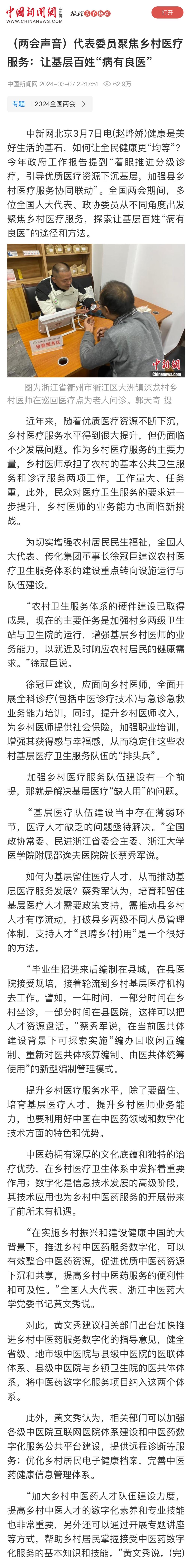 (两会声音)代表委员聚焦乡村医疗服务:让基层百姓“病有良医”