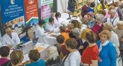 匈牙利岐黄中医药中心工作人员在匈牙利国家BOK体育中心进行义诊。